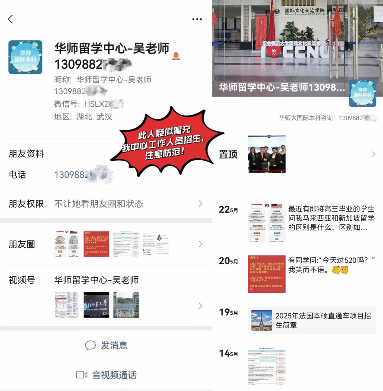 近期,我中心发现疑似不法人员冒充“华师留服中心工作人员”或“国际部招生老师”,通过电话、短信、社交平台等渠道发布违规招生简章或联系学生及家长,实施违规招生行为。