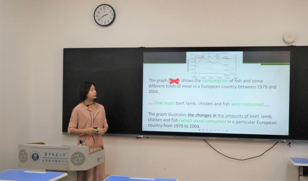 Cosimo首先介绍了雅思Task1小作文题型,除了常规的曲线图、饼状图、柱状图、表格,还有流程图和地图题,虽然题型繁多,但是“万变不离其宗”。不管哪种类型的小作文,都有方法可循。她简单阐明了雅思写作考查目的,即考查学生对信息的筛选整合、成篇输出的能力。文章写成流水账是没法看的,拿高分最核心的技巧有4点:运用精准词汇,描述主要趋势,对比突出,展现图表逻辑流程。