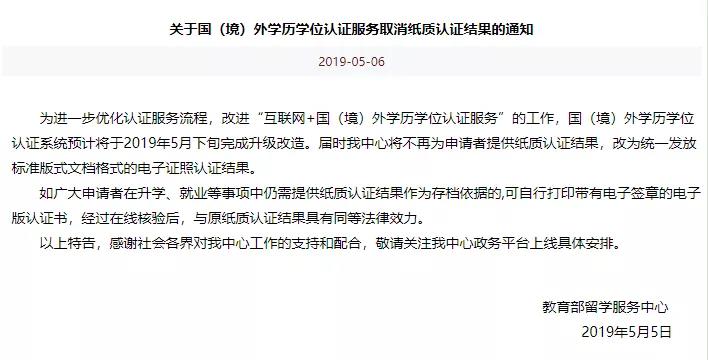 近日,教育部留学服务中心发布最新通知,国(境)外学历学位认证服务将取消纸质认证,实现全流程在线服务。以后认证申请人无需再到留学服务中心或各地验证点验看原件和提交纸质申请材料,在线即可直接提交申请材料并随时查询办理进度,认证结果出来后,申请人可网上直接打印认证书,无需等待邮寄的纸质证书。