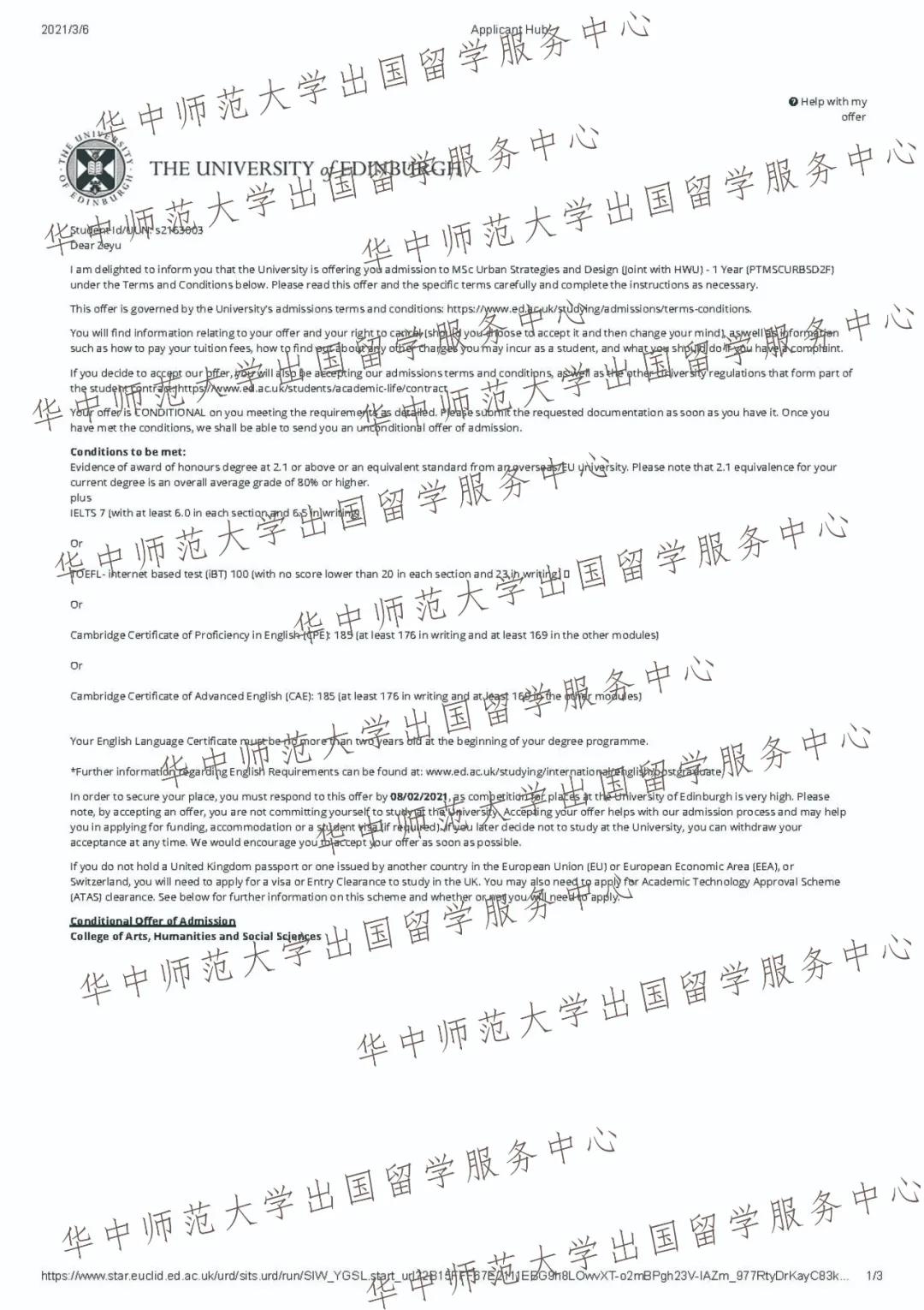 通过前几个月和华师留服老师的沟通和交流,比较愉快的完成了文书、简历及推荐信等必要申请材料的准备,并向位于不同国家和地区的多个院校递交了申请,前期我很快就已经收到了来自曼彻斯特大学和格拉斯哥大学城市规划相关专业的offer。很快,我又陆续收到了爱丁堡大学和UCL的offer。