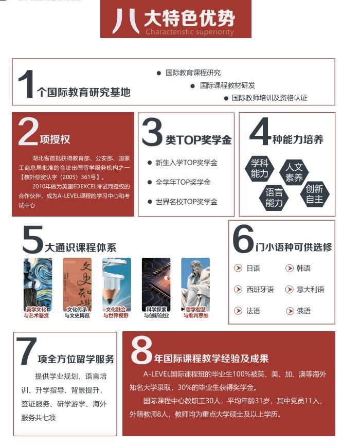 2011年经湖北省教育厅批准与湖北省武昌实验中学共同成立国际部,开展EDEXCEL A-Level课程的招生与教学