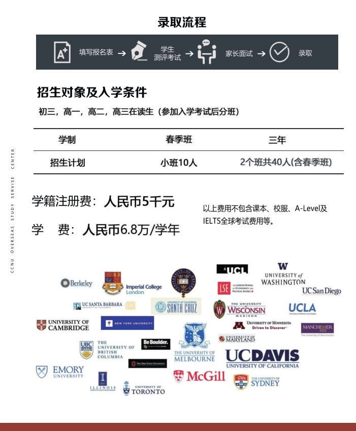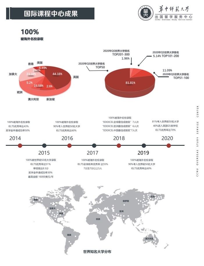 中心秉承:“忠诚博雅、朴实刚毅”的华师精神,整合华中师范大学优质资源,先后与美国、英国、加拿大、澳大利亚、意大利、新加坡、西班牙、德国等多个国家及多所全球知名大学建立了合作交流,引入了国外先进的教育理念及课程,全面实施中外教师联合执教,以科学的教育体系,完善的管理模式,致力于为莘莘学子提供高品质的教育平台,为培养优秀的国际化人才,创造全方位的国际化教育服务。