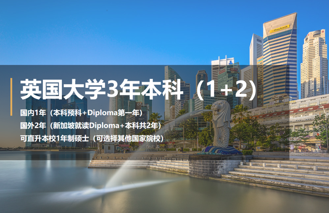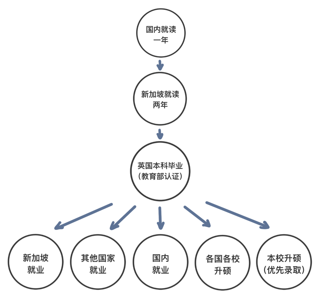 国内修完第一年(Diploma)课程后,完成海外课程最后两年(Diploma第二年+本科最后一年,新加坡就读),共计三年的学习,之后将获得英国大学颁发的学士学位(教育部留服认证),可优先录取就读本校一年制硕士课程。