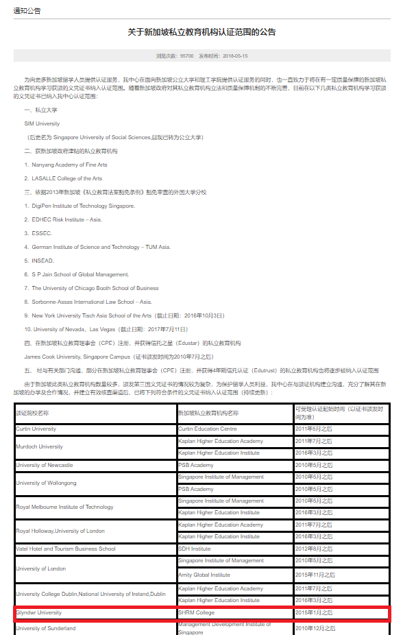 “关于新加坡私立教育机构认证范围的公告”
