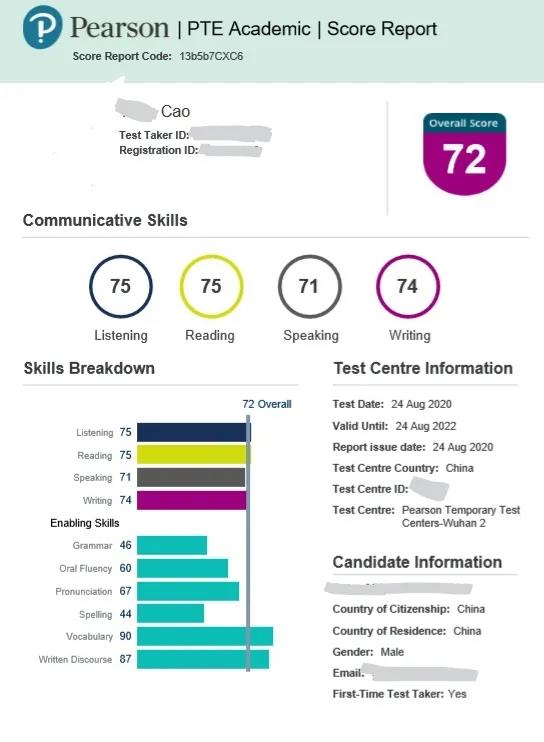 PTE暑期高能班学员曹同学在昨天刚结束的PTE学术英语考试中,首考一举取得Listening75分、Reading75分、Speaking71分、Writing75分,总分72分的好成绩,对应雅思成绩7.5分。