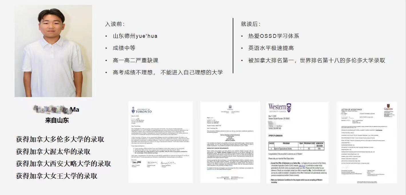 加拿大安大略省高中课程 (OSSD)是全世界最先进的中学课程体系之一,以其优质严格的教学管理在全世界具有极高的认可度,被加拿大、美国、英国、澳大利亚等全球的大学承认,是进入世界大学的通用文凭。