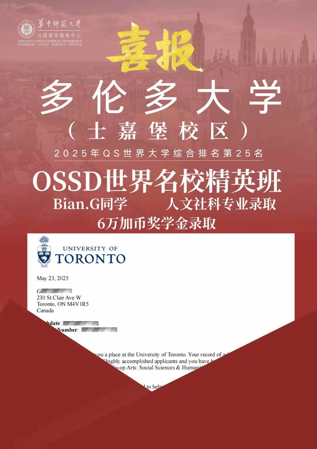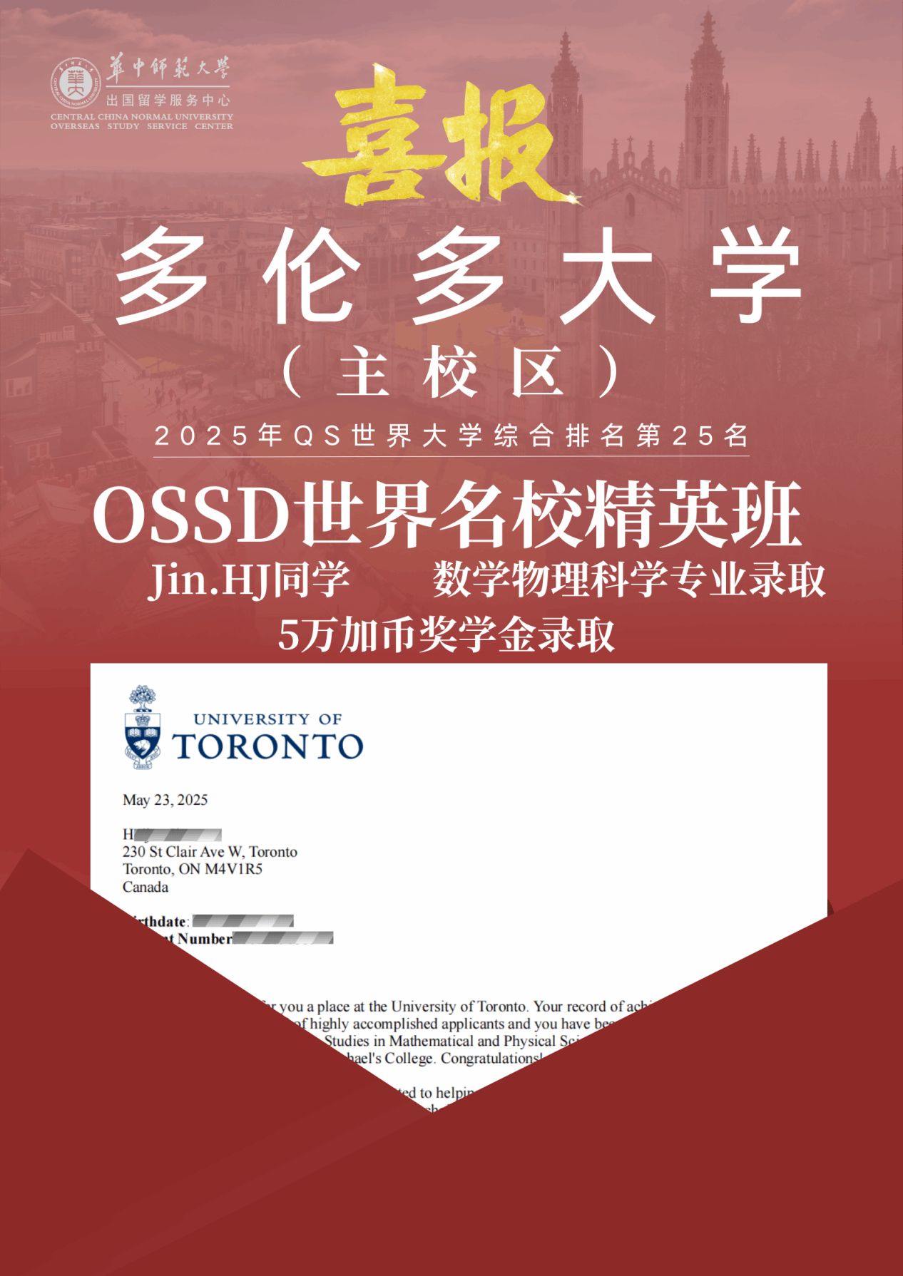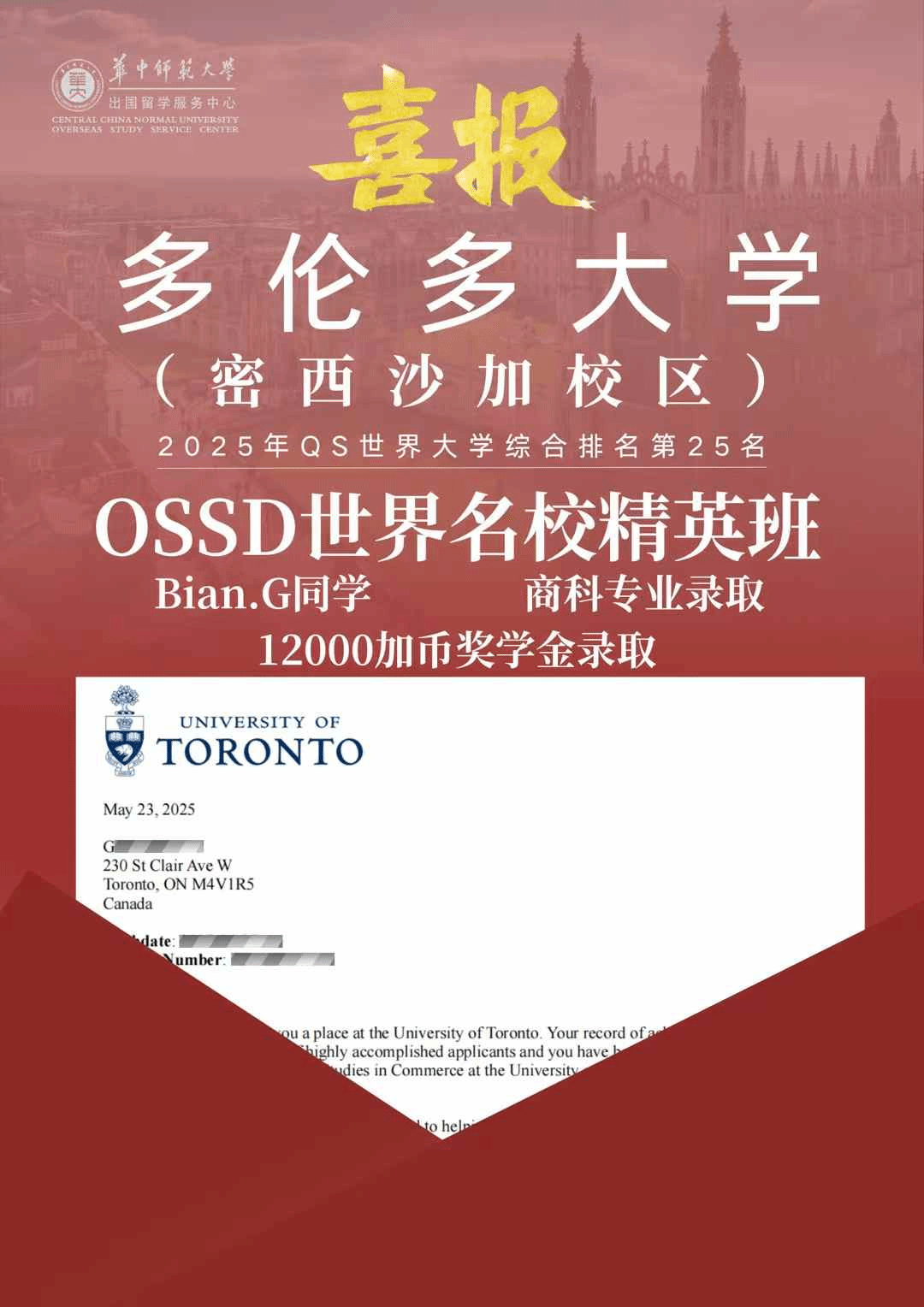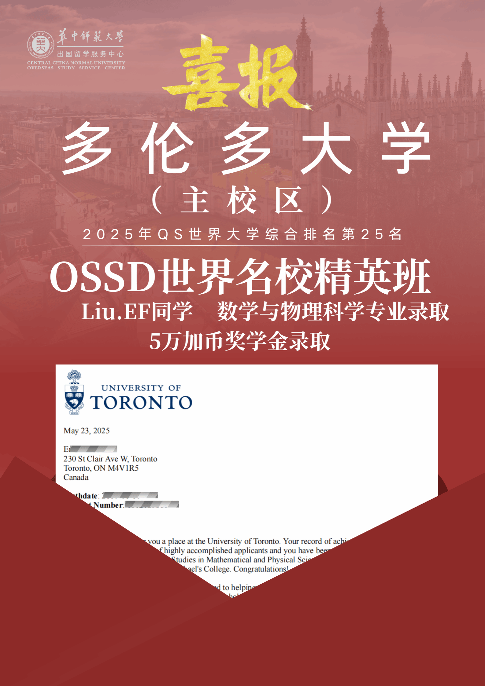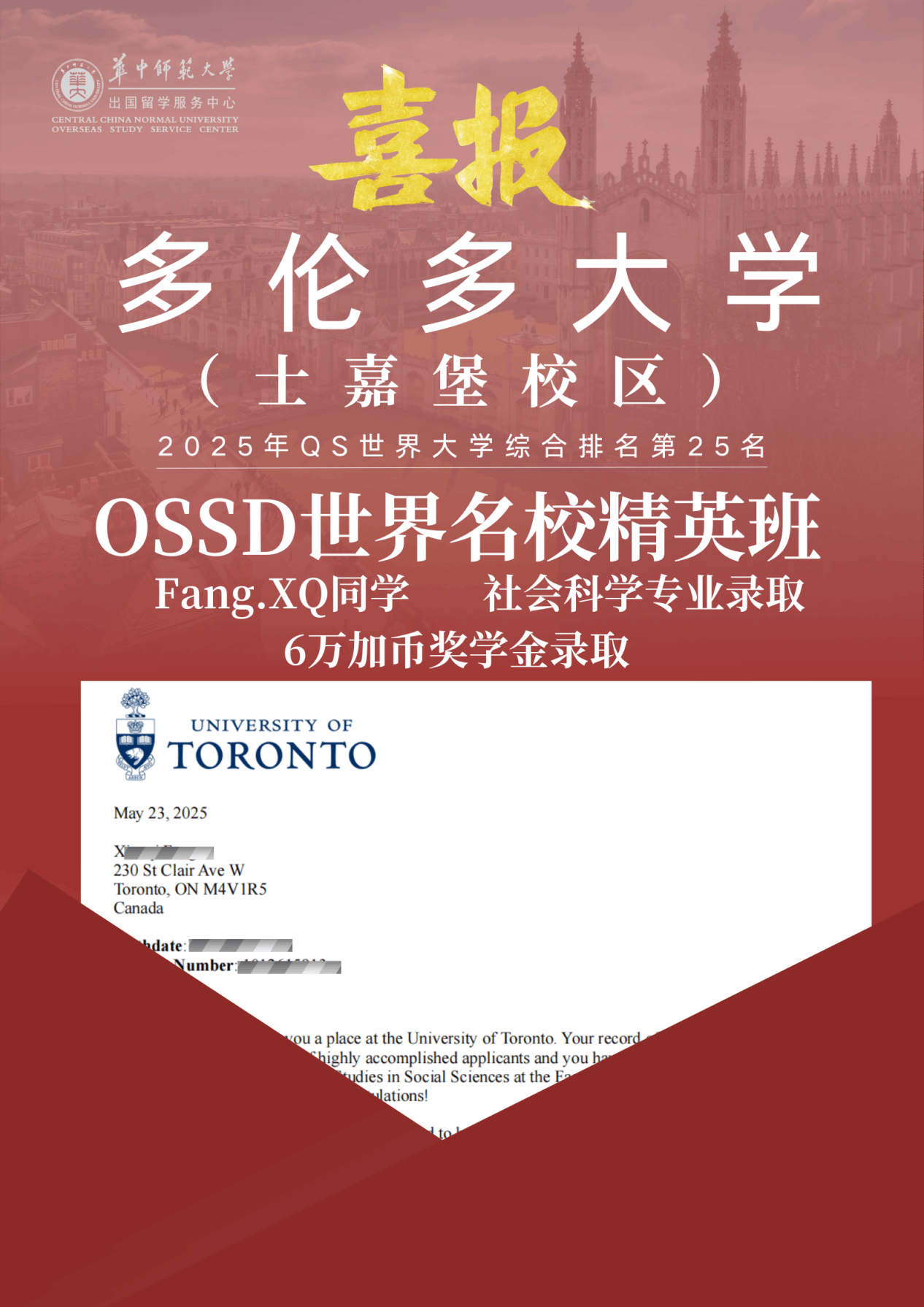 2025届还有多名同学凭借OSSD高分成绩,获得多伦多大学不同额度的奖学金及录取!