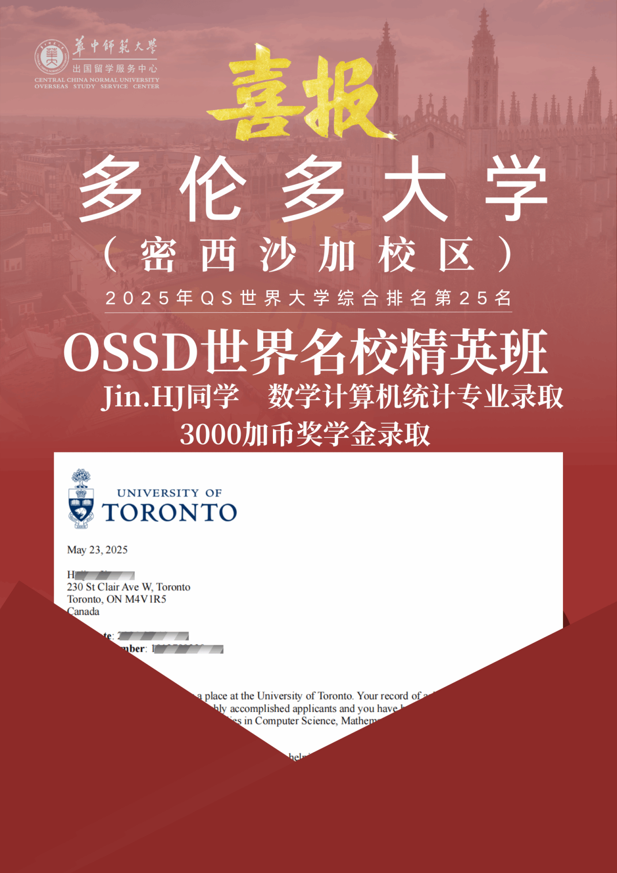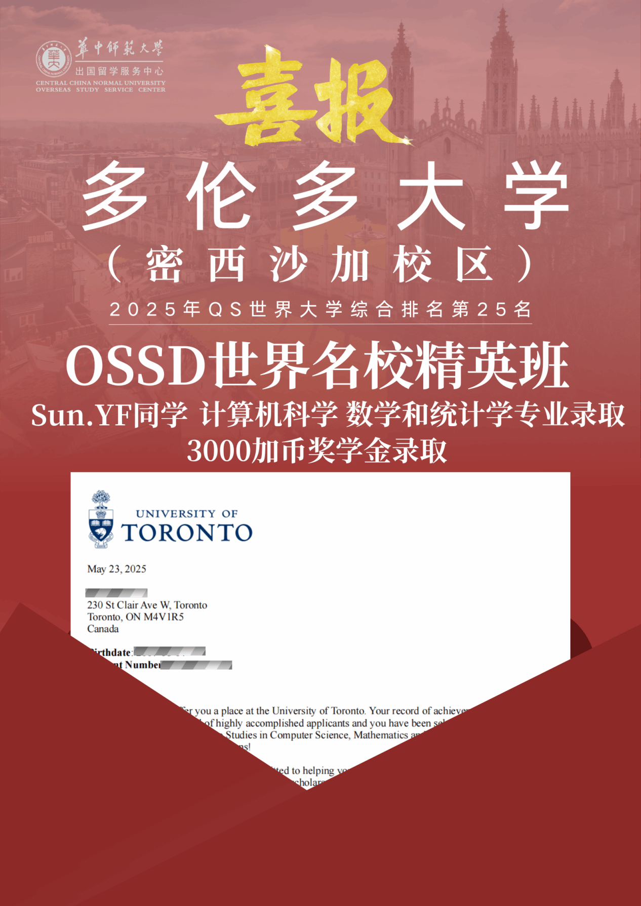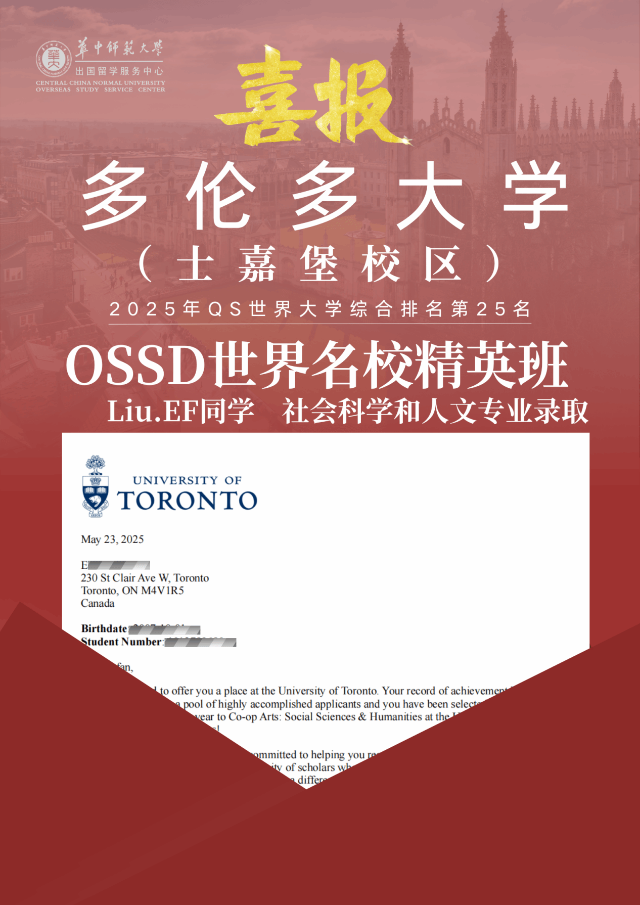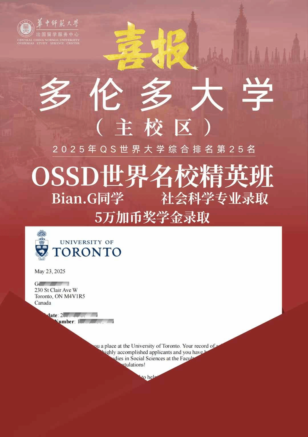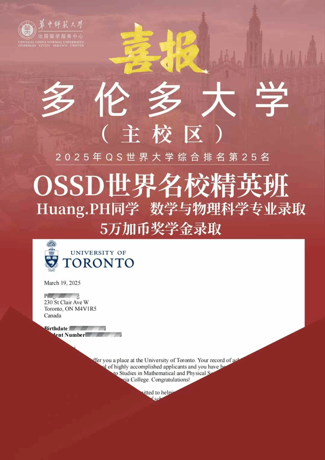 2025届还有多名同学凭借OSSD高分成绩,获得多伦多大学不同额度的奖学金及录取!
