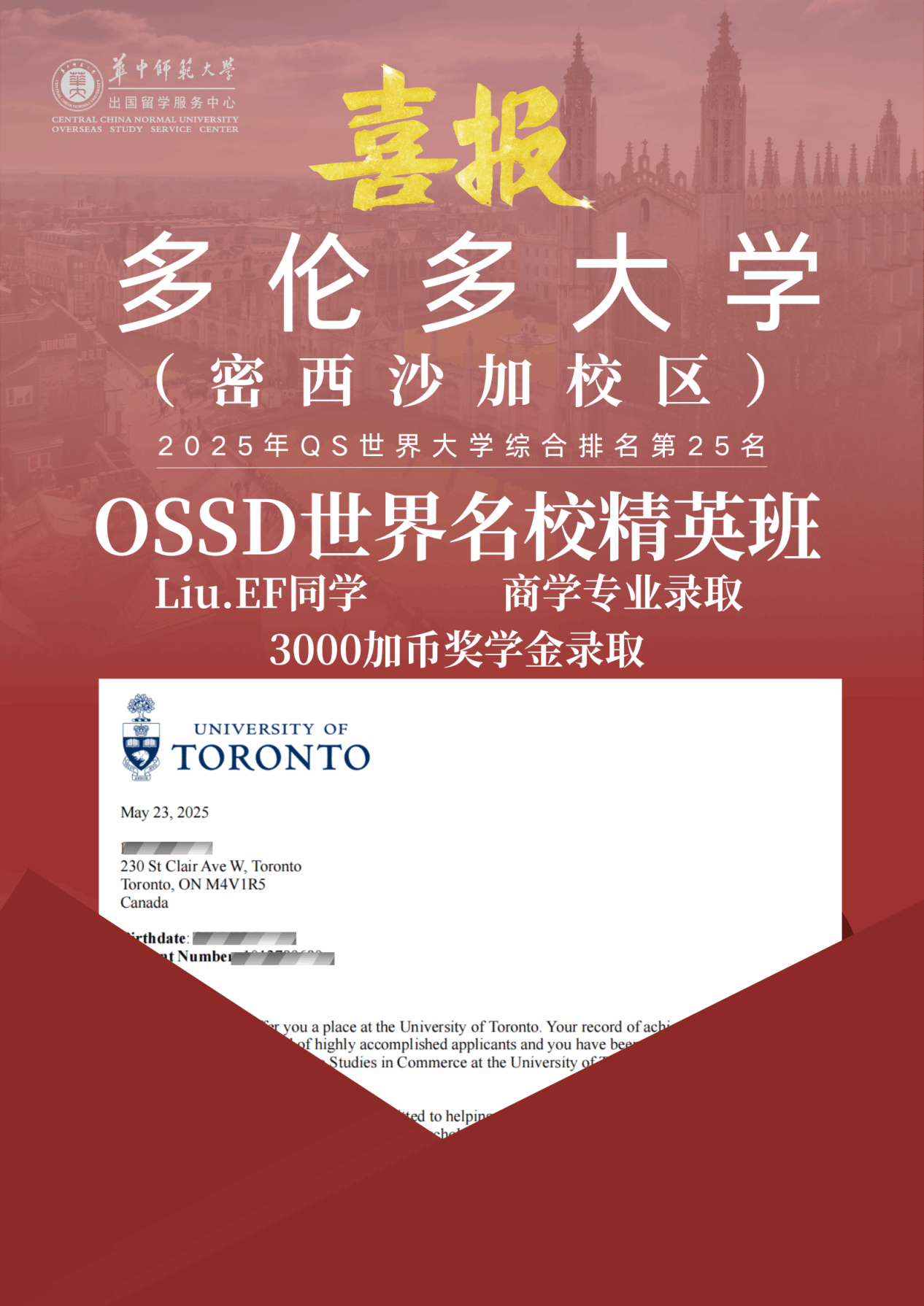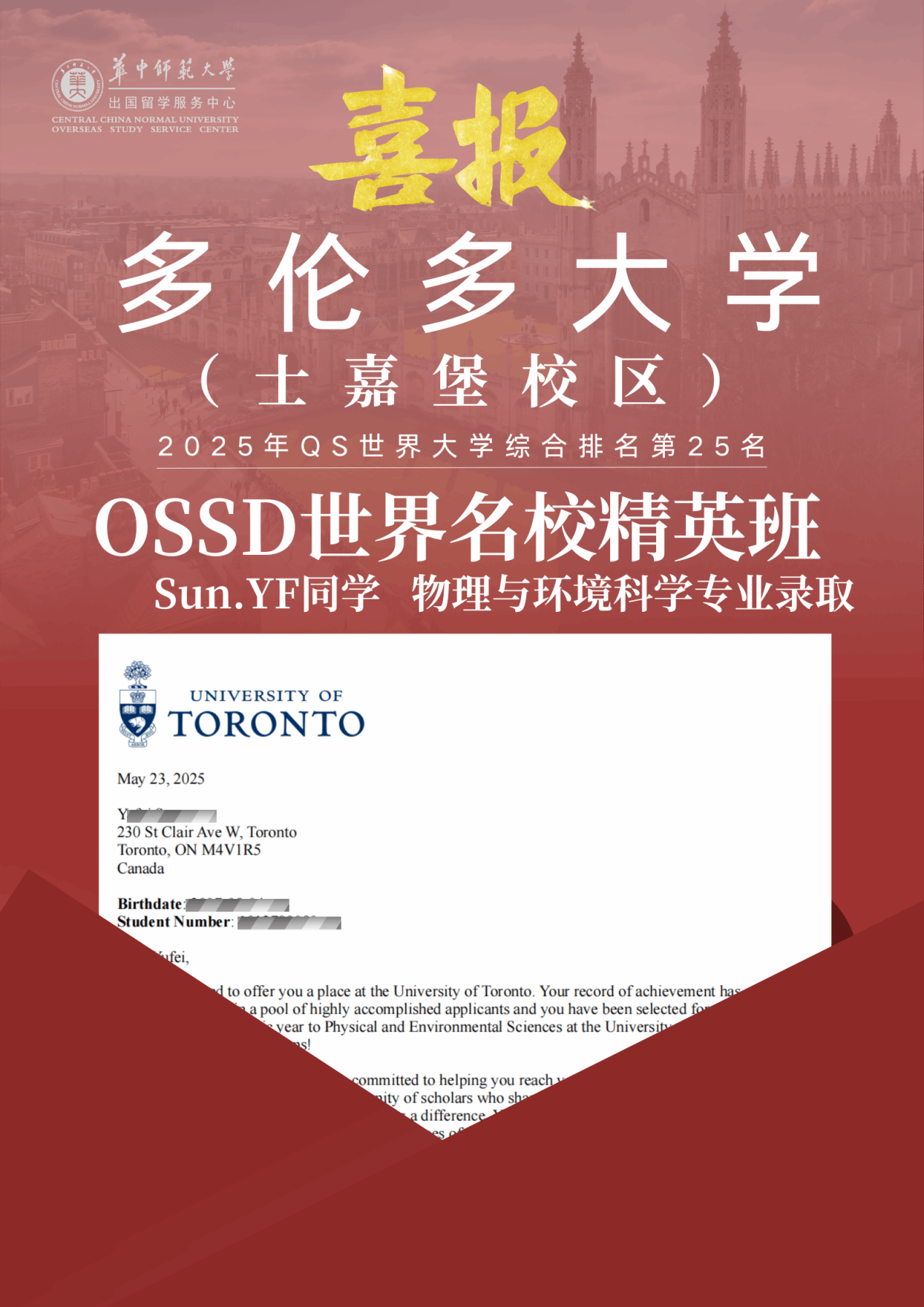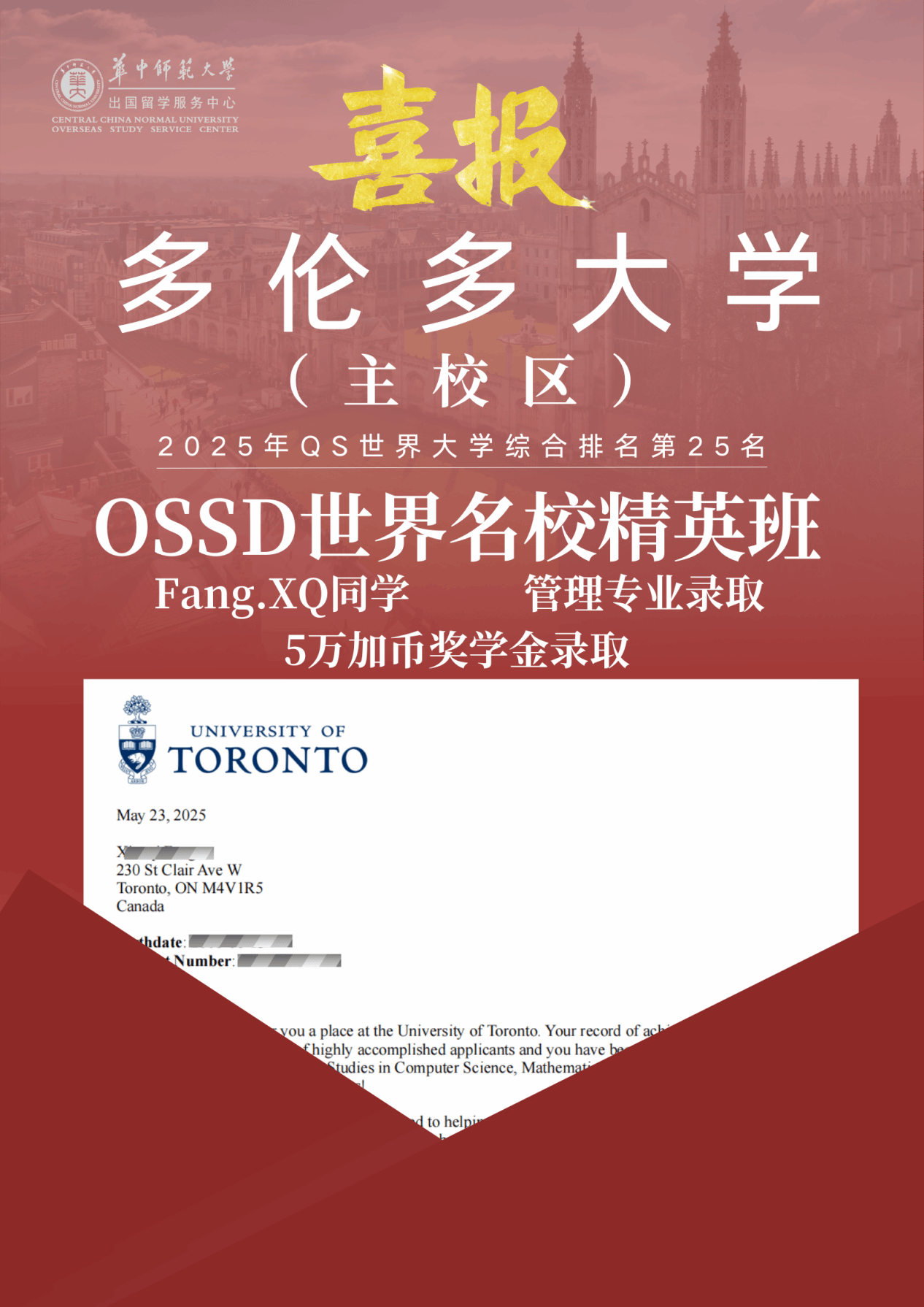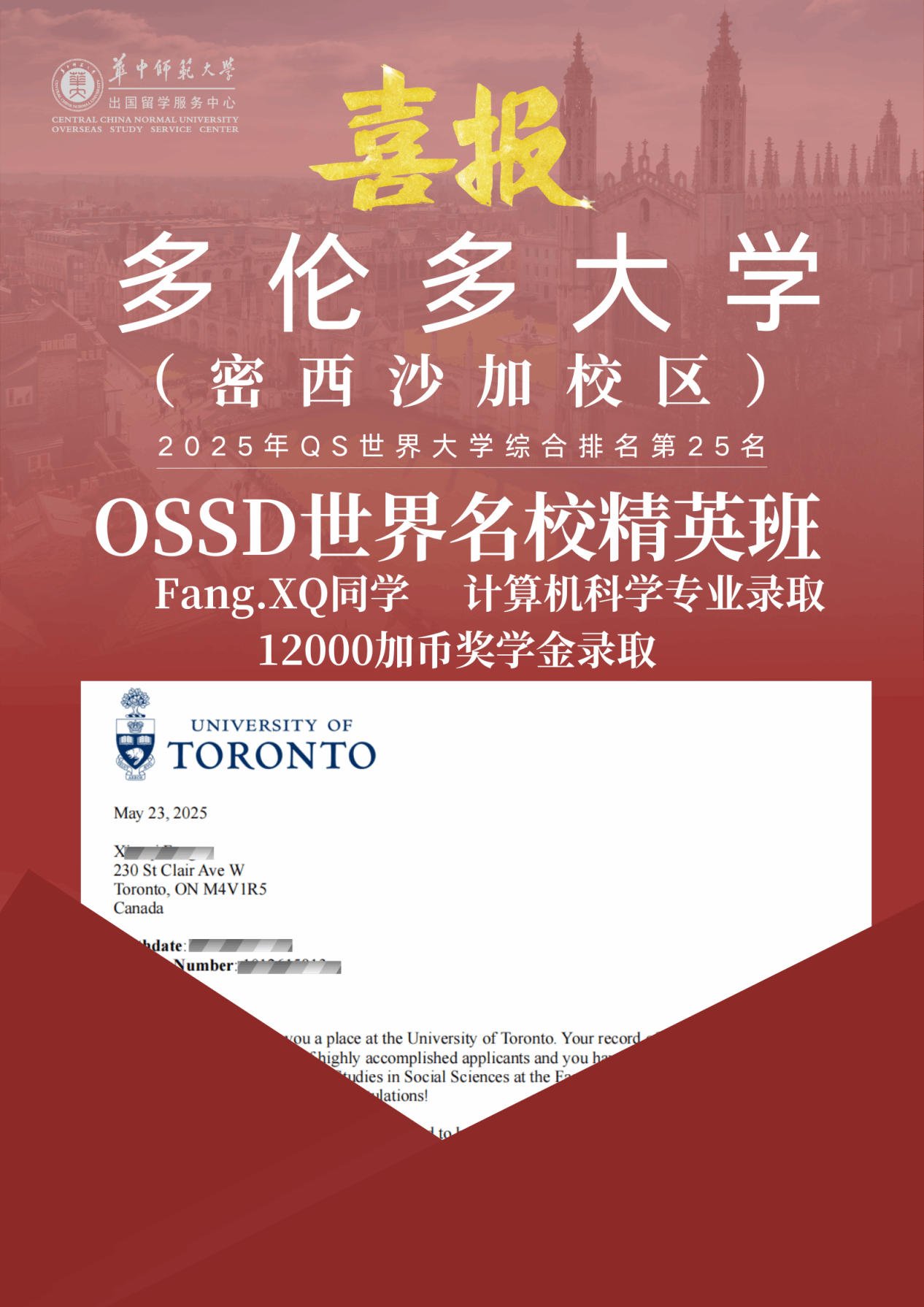 自中心OSSD项目成立以来,联系五届申请多伦多大学的学生成功获得录取,录取率保持100%,并持续刷新奖学金纪录。