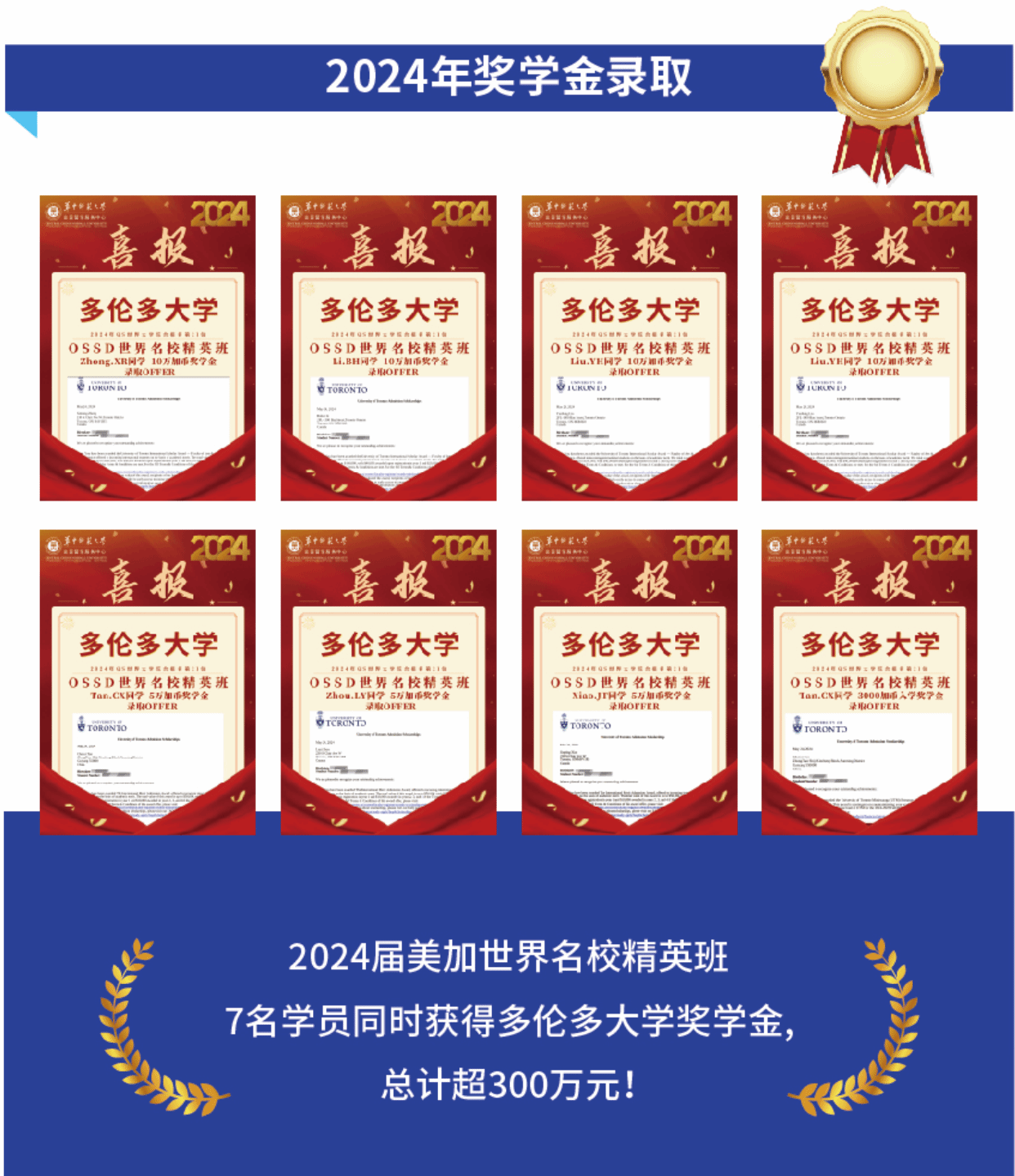 此外,2024届也有7名学员同时荣获多伦多大学奖学金。该项目学员奖学金获取比例高,单笔最高金额达10万加币(约54万人民币),仅2024届7名学生所获奖学金总额即超过人民币300万元。