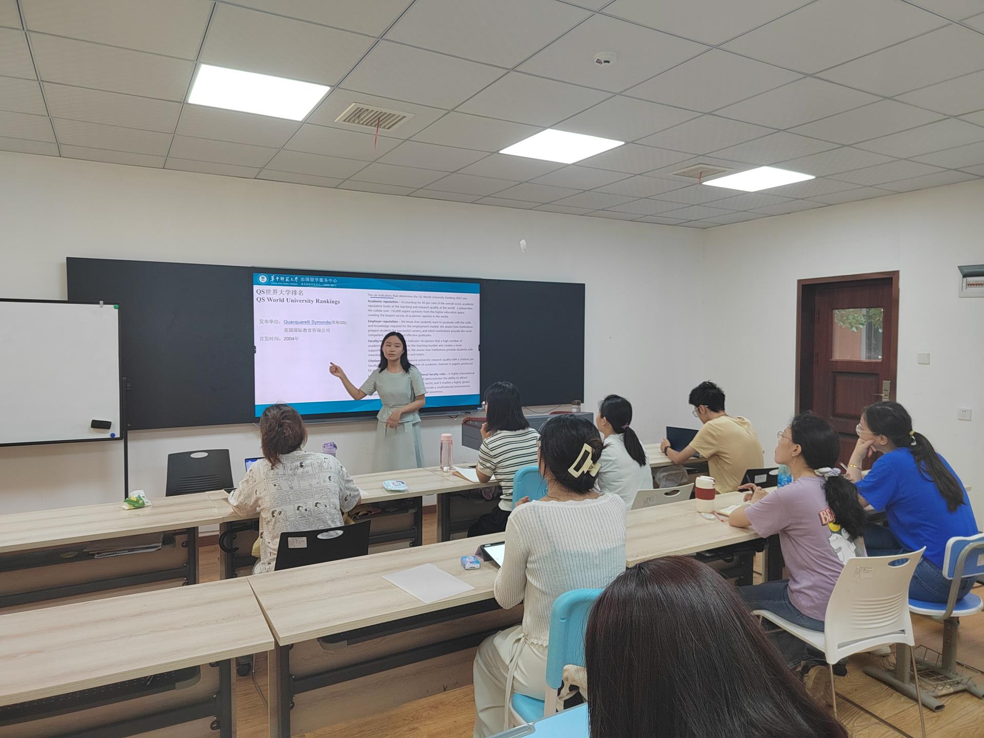 本期学员大多是来自华师化学、物理、英语等专业的研究生,及2名高年级本科生,他们拥有扎实的学科知识基础,并经历过专业的教师能力培训,但对国际教育还不甚了解。所以,培训的第一节课,课程中心的升学老师余梦婷就出国留学的脉络和流程进行了介绍。